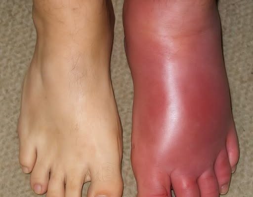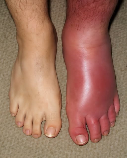 Gout or arthritis, where uric acid crystals or inflammation cause pain and swelling in the joints.