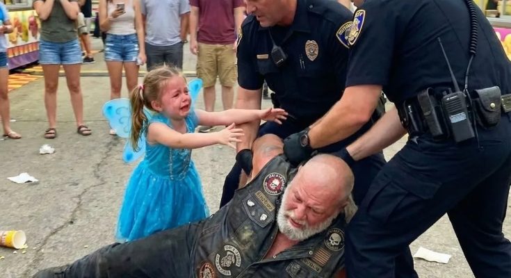 My daughter’s scream cut through the noise of the county fair like a siren, sharp enough to stop every heartbeat in its path. “That’s my grandpa!” she cried, her tiny fists pounding against the arms of the police officers who were pinning my father to the ground. A five-year-old in a pink fairy dress fighting grown men because someone decided a leather vest and long gray hair were signs of a criminal. It was a moment that would fracture our family’s sense of safety, expose the cruelty of assumptions, and reveal the fierce loyalty between a grandfather and the little girl who adores him.