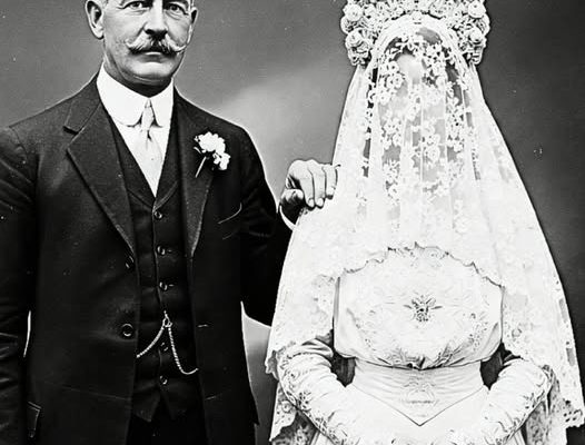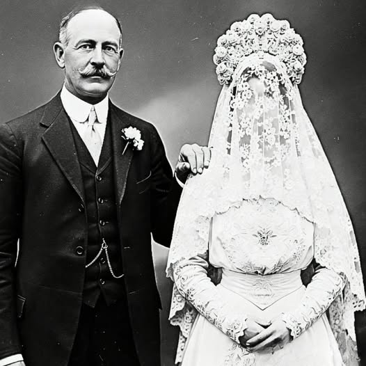 In the early 1900s, veils were common, but most were translucent, lifted, or arranged to show at least part of the face. A veil drawn completely over the bride’s features in a formal portrait is unusual enough to raise a question: Was it tradition, superstition, modesty—or an intentional effort to avoid being recognized later?